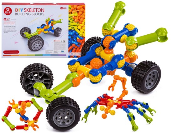 Kolorowe klocki "szkielet" to zabawka do samodzielnego zaprojektowania i zbudowania. Zestaw składa się z wielu kolorowych elementów i pozwala na dowolne budowanie wszystkiego co wymyśli dziecko. Zabawka, która przemieni dziecko w małego architekta, pobudzi wyobraźnię i pomoże rozwinąć zdolności konstruowania.