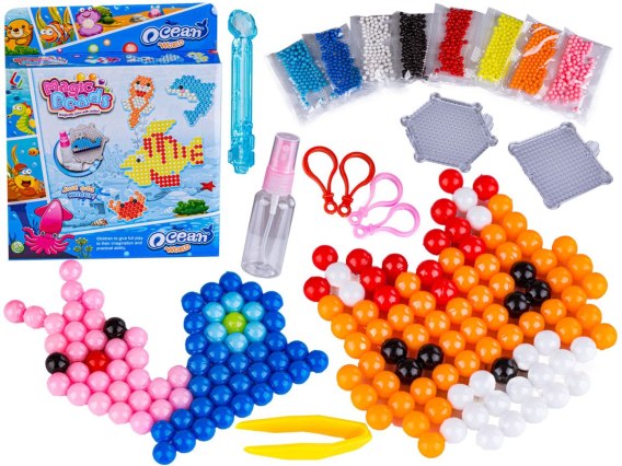 Koraliki wodne to kolorowe kuleczki, które można ze sobą dowolnie łączyć, tworząc coraz to nowe kształty, postacie, figury czy przedmioty. Koraliki zwiększają swoją przyczepność za pomocą odrobiny wody.