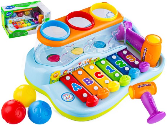 Zestaw dla młodego muzyka:Kolorowe cymbałki z wieloma funkcjami i efektami - żywa kolorystyka oraz efekty dźwiękowe naprawdę angażują w muzyczną zabawę. Oprócz tradycyjnych cymbałków zabawka wyposażona została w lekki młoteczek, którym kolejno wbijamy kolorowe piłeczki. Świetny pomysł na ćwiczenie koordynacji wzrokowo-ruchowej.  |