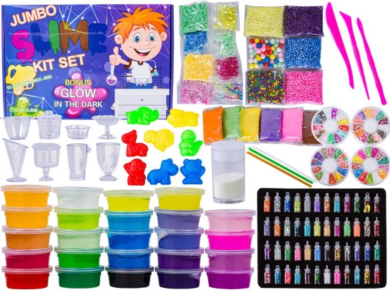 Zestaw zawiera wszystko, co jest potrzebne do stworzenia niepowtarzalnych, ciągnących się glutów - od gładkich mas stanowiących bazę po brokatowe, kuleczkowe i piankowe ozdobniki.